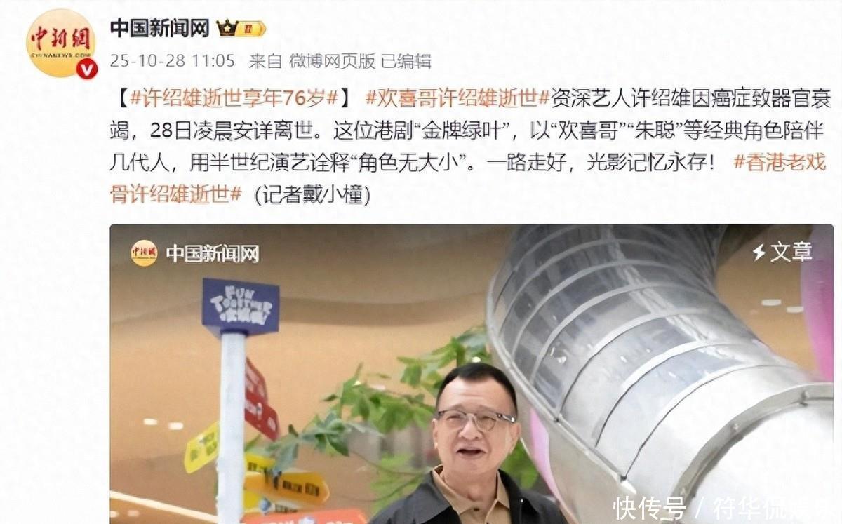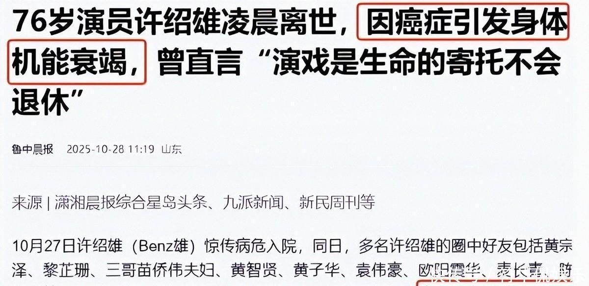 10月28日凌晨约2点30分,许绍雄因癌症诱发器官衰竭安详离开,前一晚他的朋友们被紧急召到医院探望,翌日上午家人通过黎芷珊向媒体确认死讯,TVB随即发文悼念他一直没向公众透露患癌这件事发生得太突然,很多人前一天还在看他的新剧,第二天就只能在剪辑里重看他的笑容